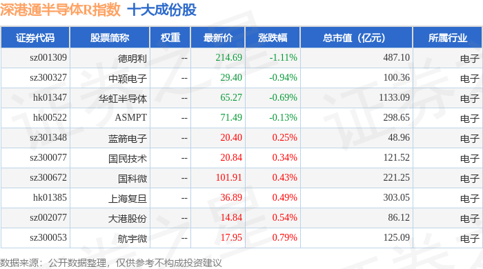 深港通半导体R(483067)指数十大成份股详情如下: