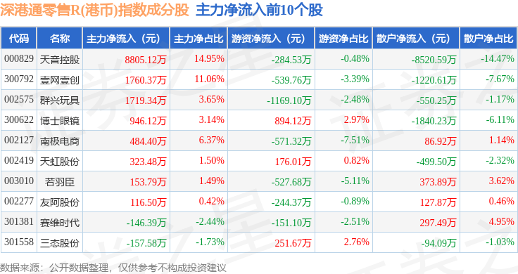 资金流向方面,深港通零售R(港币)(483074)指数成份股当日主力资金净流入合计801.5万元,游资资金净流出合计1459.03万元,散户资金净流入合计657.54万元。成份股资金流向详情见下表: