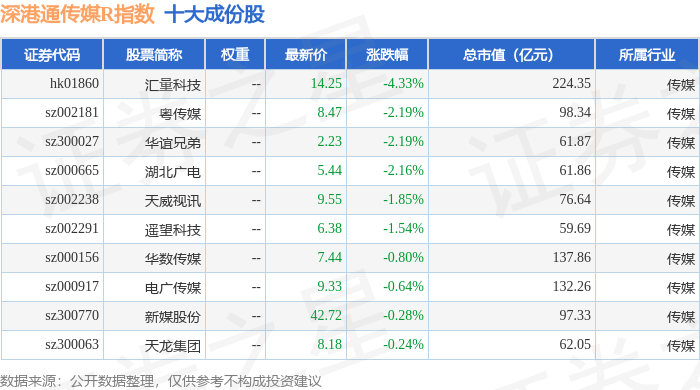 证券之星消息,12月12日,深港通传媒R(483075)指数报收于2296.75点,涨1.3%,成交253.31亿元,换手率2.53%。当日该指数成份股中,上涨的有31家,博纳影业以9.97%的涨幅领涨,下跌的有12家,汇量科技以4.33%的跌幅领跌。