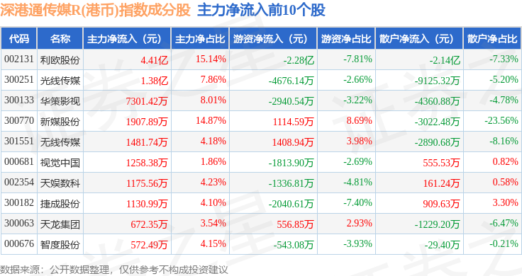 资金流向方面,深港通传媒R(港币)(483076)指数成份股当日主力资金净流出合计6515.47万元,游资资金净流出合计2.88亿元,散户资金净流入合计3.53亿元。成份股资金流向详情见下表: