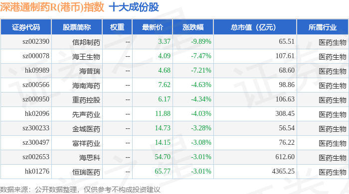 深港通制药R(港币)(483080)指数十大成份股详情如下: