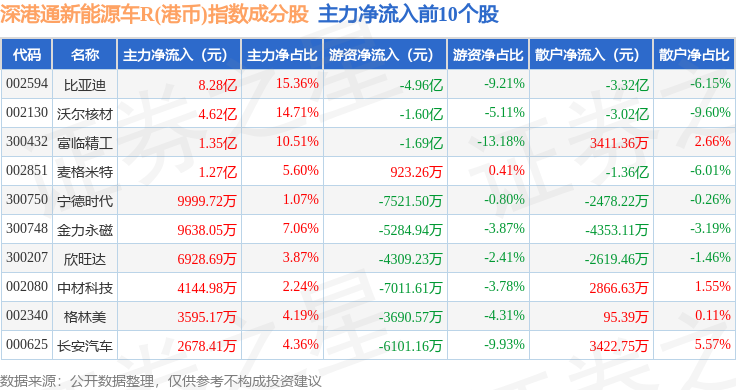 资金流向方面,深港通新能源车R(港币)(483088)指数成份股当日主力资金净流出合计13.33亿元,游资资金净流出合计13.27亿元,散户资金净流入合计26.6亿元。成份股资金流向详情见下表: