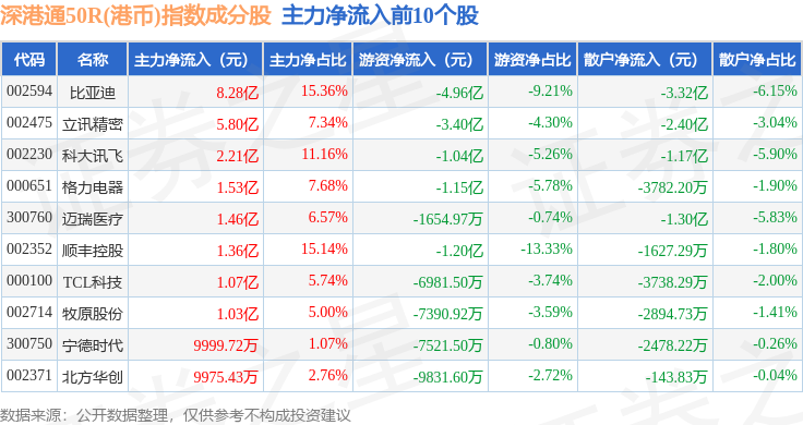 资金流向方面,深港通50R(港币)(483092)指数成份股当日主力资金净流出合计7.6亿元,游资资金净流入合计7948.5万元,散户资金净流入合计6.81亿元。成份股资金流向详情见下表: