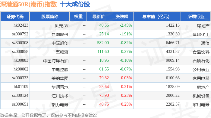 深港通50R(港币)(483092)指数十大成份股详情如下:
