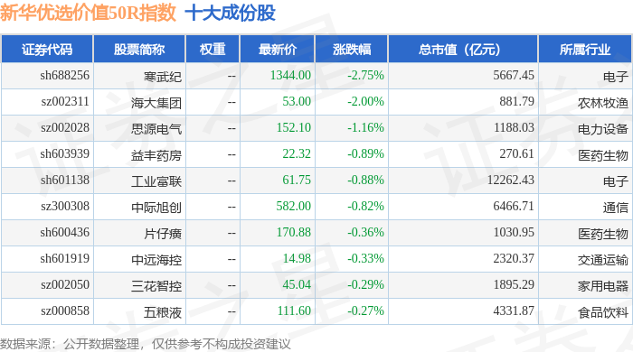 新华优选价值50R(489004)指数十大成份股详情如下: