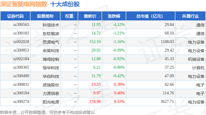 深证智能电网(970054)指数十大成份股详情如下: