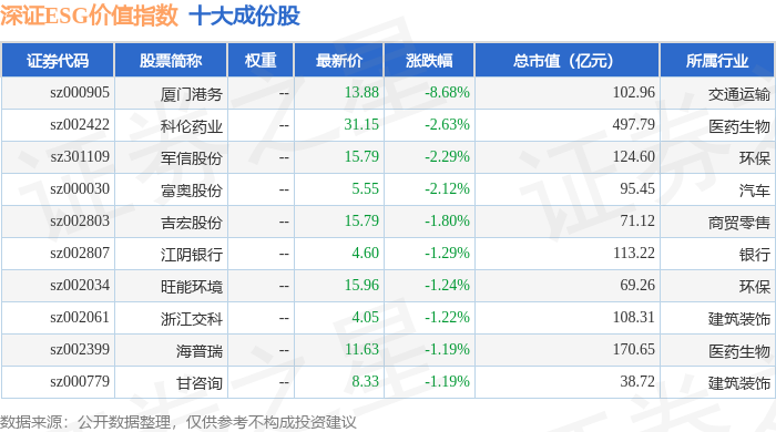证券之星消息,12月12日,深证ESG价值(970061)指数报收于1623.12点,涨0.72%,成交360.12亿元,换手率1.61%。当日该指数成份股中,上涨的有25家,常宝股份以10.04%的涨幅领涨,下跌的有24家,厦门港务以8.68%的跌幅领跌。