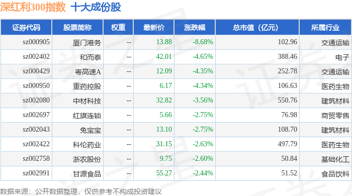 证券之星消息,12月12日,深红利300(970062)指数报收于5505.93点,涨0.45%,成交1983.7亿元,换手率1.82%。当日该指数成份股中,上涨的有174家,蓝晓科技以12.69%的涨幅领涨,下跌的有117家,厦门港务以8.68%的跌幅领跌。