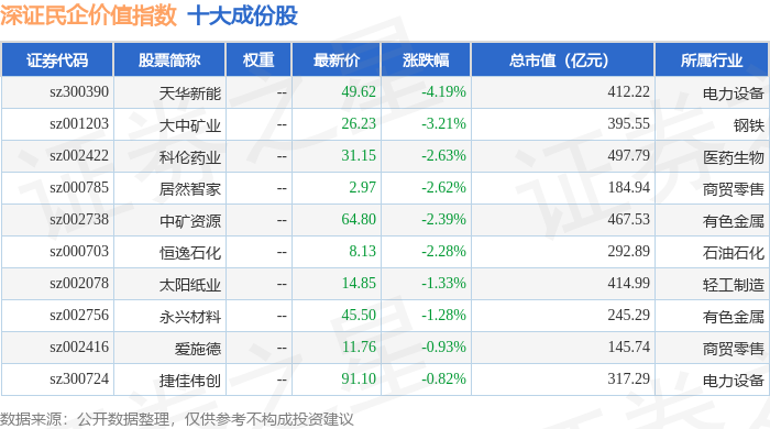 深证民企价值(970072)指数十大成份股详情如下: