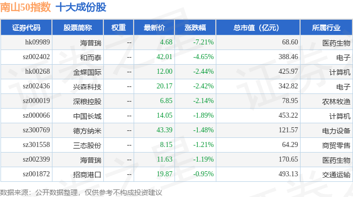 南山50(980023)指数十大成份股详情如下: