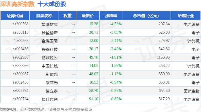 深圳高新(980038)指数十大成份股详情如下: