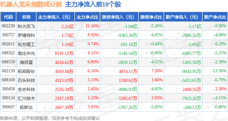 资金流向方面,机器人龙头(980071)指数成份股当日主力资金净流出合计5.94亿元,游资资金净流出合计4.16亿元,散户资金净流入合计10.1亿元。成份股资金流向详情见下表: