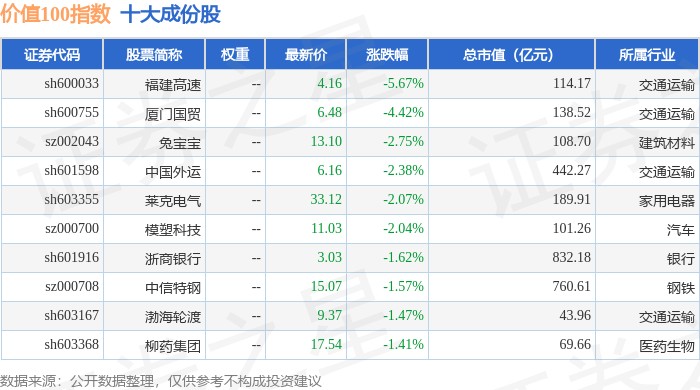 证券之星消息,12月12日,价值100(980081)指数报收于4343.78点,涨0.33%,成交558.46亿元,换手率0.83%。当日该指数成份股中,上涨的有52家,常宝股份以10.04%的涨幅领涨,下跌的有45家,福建高速以5.67%的跌幅领跌。