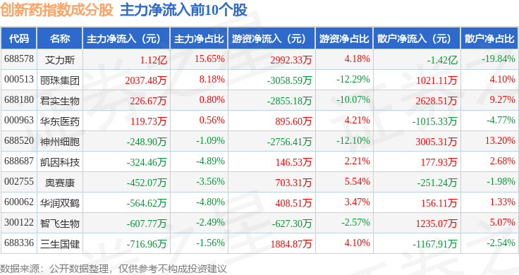 资金流向方面,创新药(980086)指数成份股当日主力资金净流出合计7.03亿元,游资资金净流入合计3.97亿元,散户资金净流入合计3.06亿元。成份股资金流向详情见下表: