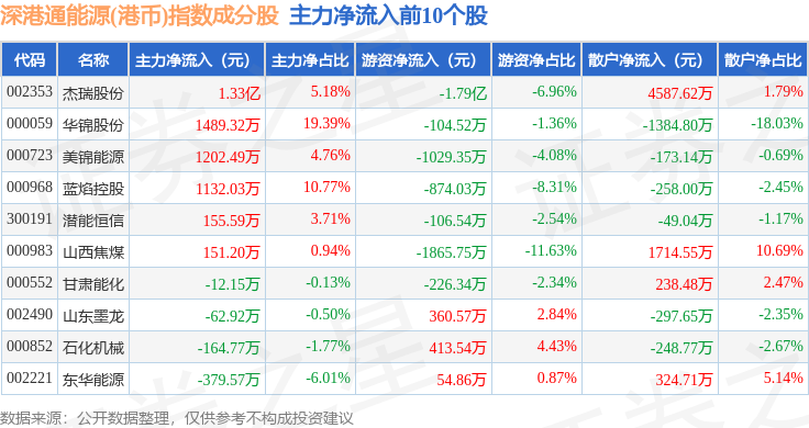 资金流向方面,深港通能源(港币)(983014)指数成份股当日主力资金净流入合计1.36亿元,游资资金净流出合计2.45亿元,散户资金净流入合计1.09亿元。成份股资金流向详情见下表: