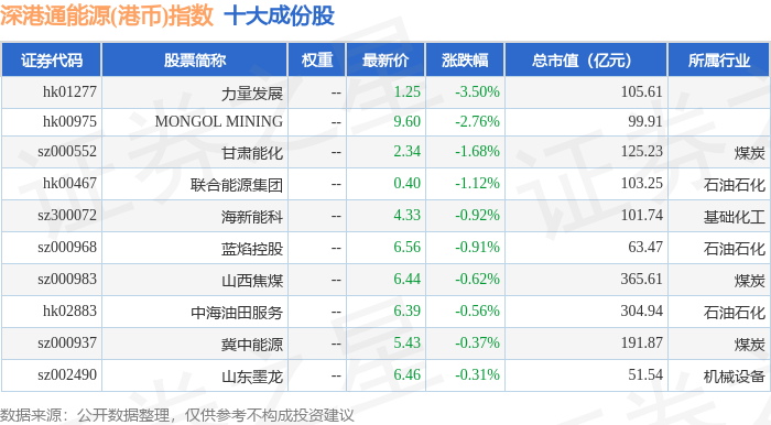 深港通能源(港币)(983014)指数十大成份股详情如下: