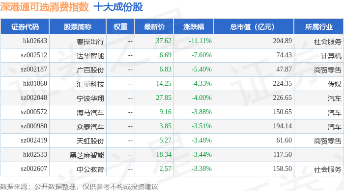 证券之星消息,12月12日,深港通可选消费(983019)指数报收于5654.55点,涨1.03%,成交1217.85亿元,换手率1.65%。当日该指数成份股中,上涨的有195家,狮腾控股以14.55%的涨幅领涨,下跌的有105家,曹操出行以11.11%的跌幅领跌。