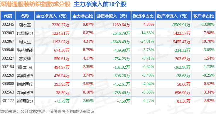 资金流向方面,深港通服装纺织(983041)指数成份股当日主力资金净流出合计3293.73万元,游资资金净流出合计4257.01万元,散户资金净流入合计7550.75万元。成份股资金流向详情见下表: