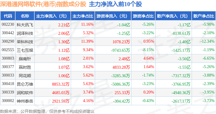 资金流向方面,深港通网络软件(港币)(983048)指数成份股当日主力资金净流出合计3.01亿元,游资资金净流出合计2.86亿元,散户资金净流入合计5.87亿元。成份股资金流向详情见下表: