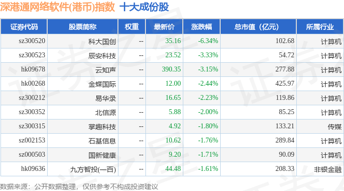 深港通网络软件(港币)(983048)指数十大成份股详情如下: