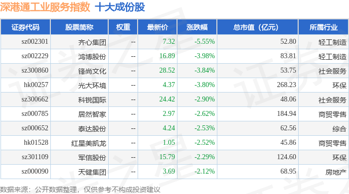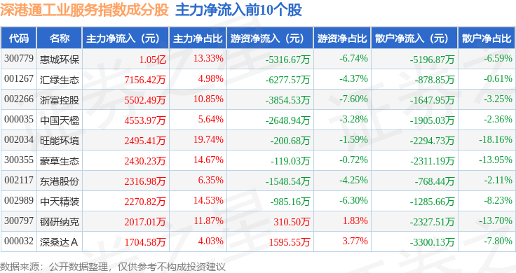资金流向方面,深港通工业服务(983055)指数成份股当日主力资金净流出合计9002.64万元,游资资金净流出合计3.68亿元,散户资金净流入合计4.58亿元。成份股资金流向详情见下表: