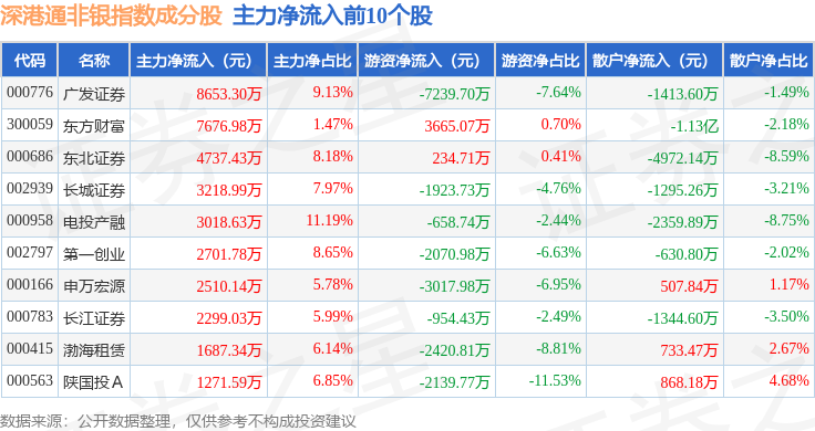资金流向方面,深港通非银(983053)指数成份股当日主力资金净流入合计2.56亿元,游资资金净流出合计1.9亿元,散户资金净流出合计6599.9万元。成份股资金流向详情见下表: