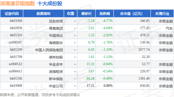 深港通非银(983053)指数十大成份股详情如下: