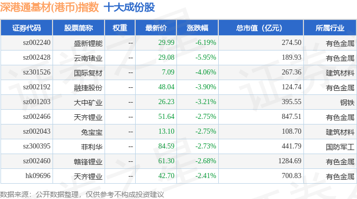 深港通基材(港币)(983062)指数十大成份股详情如下: