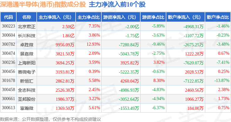 资金流向方面,深港通半导体(港币)(983068)指数成份股当日主力资金净流入合计1.29亿元,游资资金净流出合计7.08亿元,散户资金净流入合计5.79亿元。成份股资金流向详情见下表:
