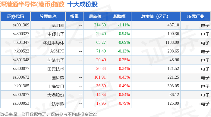 深港通半导体(港币)(983068)指数十大成份股详情如下: