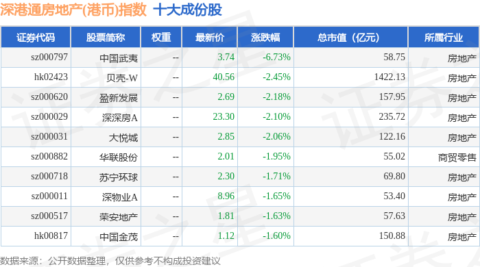 深港通房地产(港币)(983072)指数十大成份股详情如下: