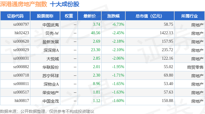 证券之星消息,12月12日,深港通房地产(983071)指数报收于2296.56点,涨0.81%,成交120.47亿元,换手率0.85%。当日该指数成份股中,上涨的有43家,龙光集团以4.4%的涨幅领涨,下跌的有26家,中国武夷以6.73%的跌幅领跌。
