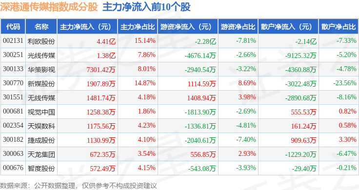 资金流向方面,深港通传媒(983075)指数成份股当日主力资金净流出合计6515.47万元,游资资金净流出合计2.88亿元,散户资金净流入合计3.53亿元。成份股资金流向详情见下表: