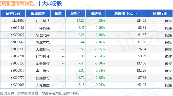 证券之星消息,12月12日,深港通传媒(983075)指数报收于2096.14点,涨1.3%,成交253.31亿元,换手率2.53%。当日该指数成份股中,上涨的有31家,博纳影业以9.97%的涨幅领涨,下跌的有12家,汇量科技以4.33%的跌幅领跌。