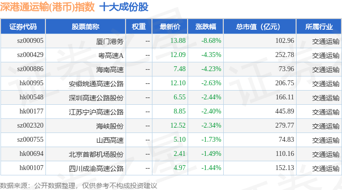 深港通运输(港币)(983078)指数十大成份股详情如下: