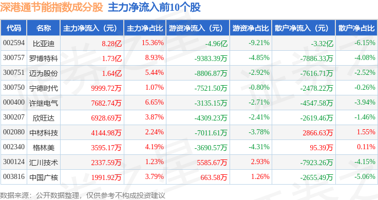 资金流向方面,深港通节能(983085)指数成份股当日主力资金净流出合计35.44亿元,游资资金净流出合计1.1亿元,散户资金净流入合计36.54亿元。成份股资金流向详情见下表: