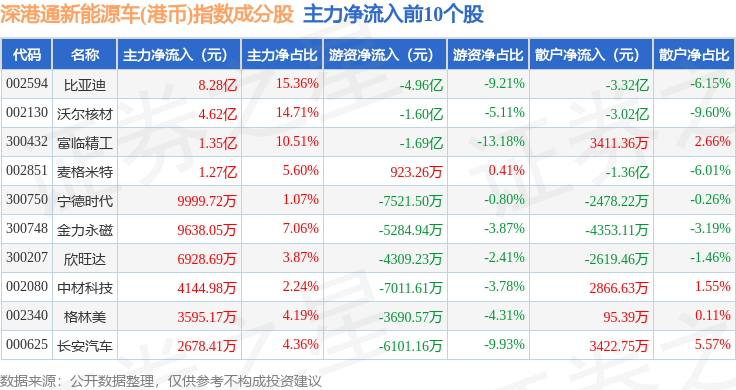 资金流向方面,深港通新能源车(港币)(983088)指数成份股当日主力资金净流出合计13.33亿元,游资资金净流出合计13.27亿元,散户资金净流入合计26.6亿元。成份股资金流向详情见下表: