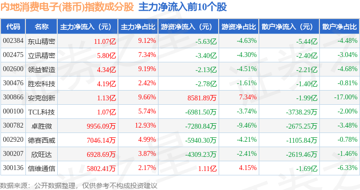资金流向方面,内地消费电子(港币)(983106)指数成份股当日主力资金净流入合计2.14亿元,游资资金净流出合计10.35亿元,散户资金净流入合计8.21亿元。成份股资金流向详情见下表: