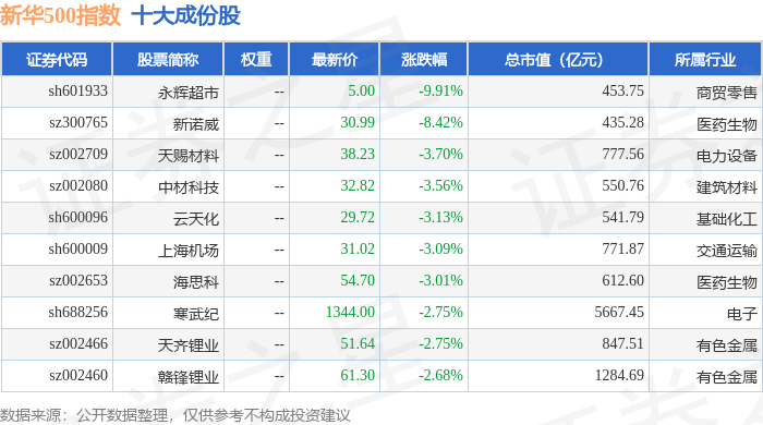 新华500(989001)指数十大成份股详情如下: