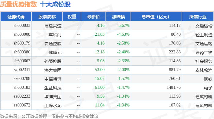 质量优势(989017)指数十大成份股详情如下: