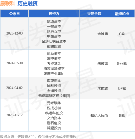证券之星消息,根据天眼查APP于12月3日公布的信息整理,晟联科(上海)技术有限公司C轮融资,融资额未披露,参与投资的机构包括致道资本,一村资本,张科垚坤,中鑫资本,金沙江联合资本,能骏投资。