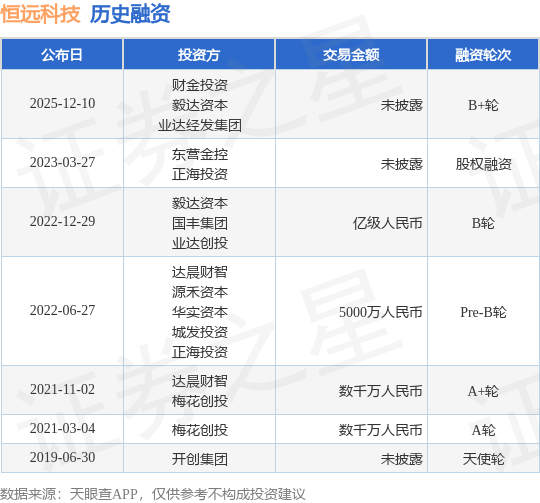 证券之星消息,根据天眼查APP于12月10日公布的信息整理,山东恒远智能科技有限公司B+轮融资,融资额未披露,参与投资的机构包括财金投资,毅达资本,业达经发集团。