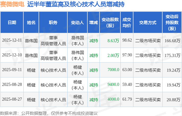 赛微微电近半年内的董监高及核心技术人员增减持详情如下: