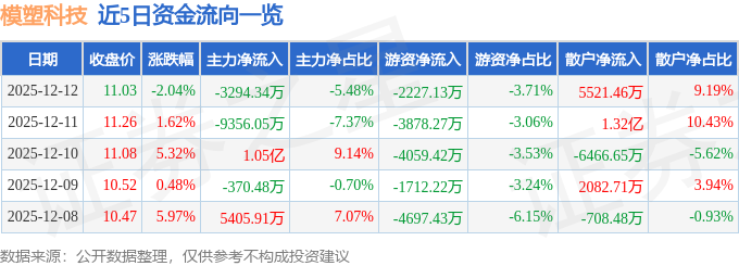 证券之星消息,截至2025年12月12日收盘,模塑科技(000700)报收于11.03元,下跌2.04%,换手率5.85%,成交量53.71万手,成交额6.01亿元。
