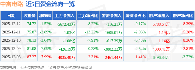 证券之星消息,截至2025年12月12日收盘,中富电路(300814)报收于74.72元,下跌1.52%,换手率4.81%,成交量9.21万手,成交额6.9亿元。