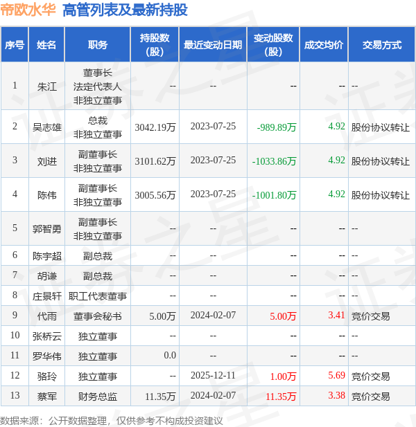 帝欧水华的高管列表及最新持股情况如下: