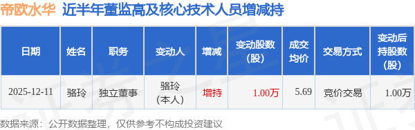 证券之星消息,根据12月12日市场公开信息、上市公司公告及交易所披露数据整理,帝欧水华(002798)最新董监高及相关人员股份变动情况:2025年12月11日公司独立董事骆玲共增持公司股份1.0万股,占公司总股本为0.0019%。变动期间公司股价下跌3.24%,12月11日当日收盘报5.68元。