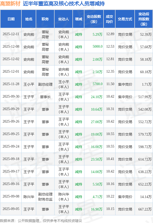 高盟新材近半年内的董监高及核心技术人员增减持详情如下: