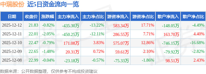 证券之星消息,截至2025年12月12日收盘,中瑞股份(301587)报收于21.83元,下跌0.82%,换手率2.04%,成交量1.5万手,成交额3293.8万元。