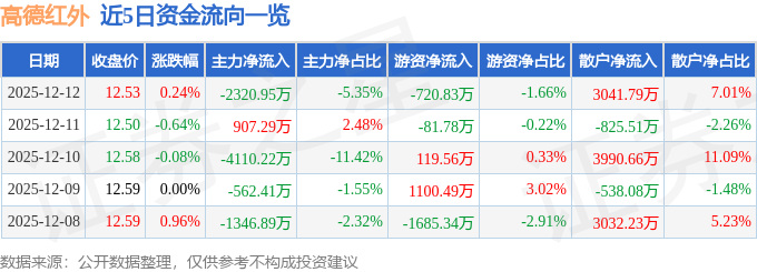证券之星消息,截至2025年12月12日收盘,高德红外(002414)报收于12.53元,上涨0.24%,换手率1.02%,成交量34.68万手,成交额4.34亿元。